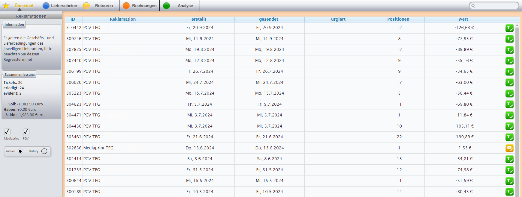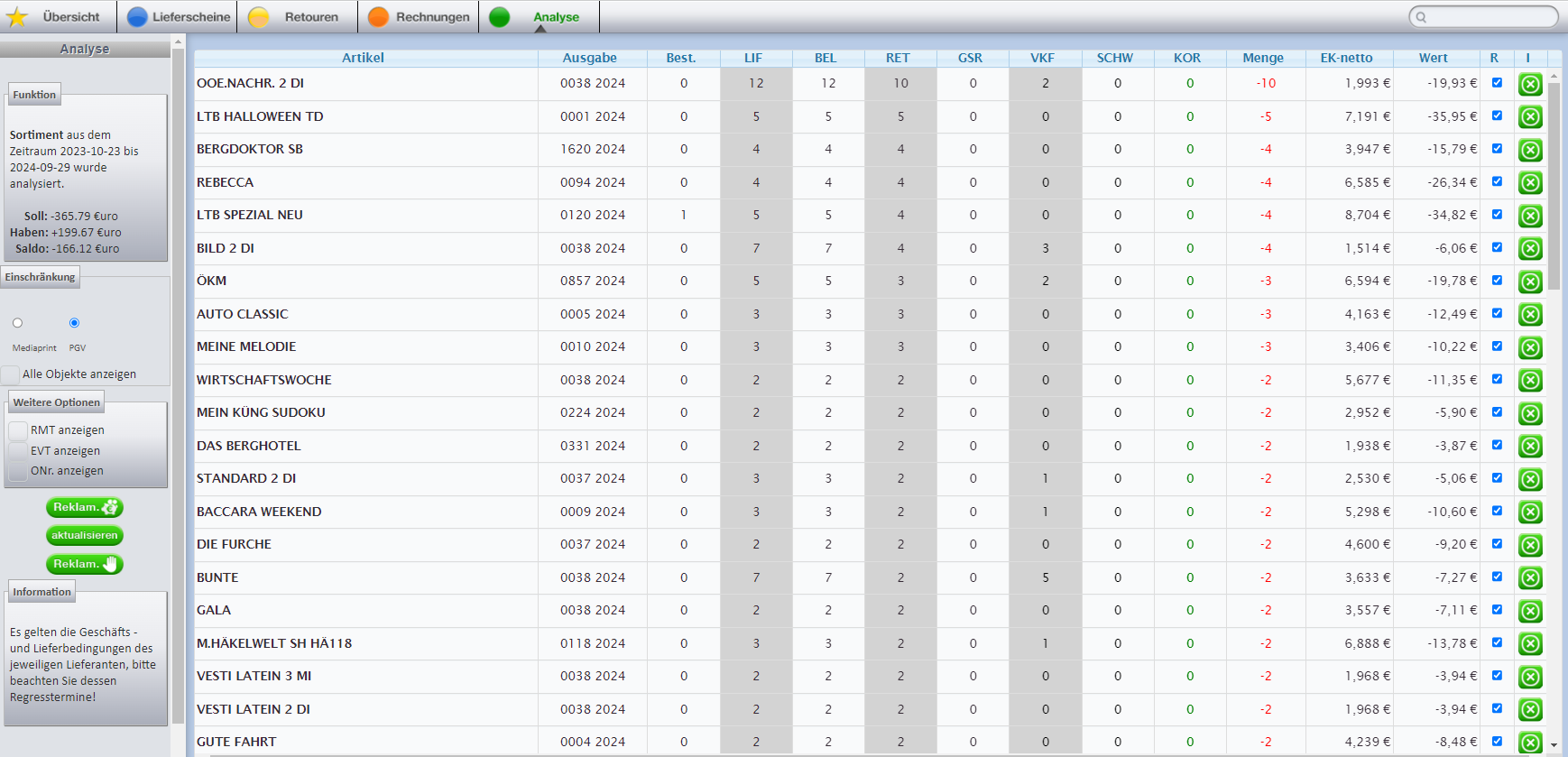 In der Analyse werden nur Abweichung bezüglich Lieferungen / Belastungen und Retouren / Gutschriften angezeigt, die dann per Klick beim Grossisten reklamiert werden können.