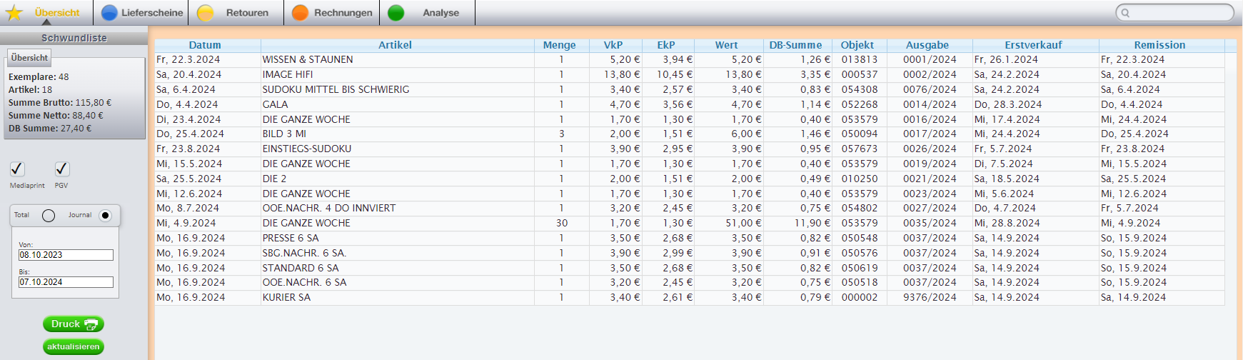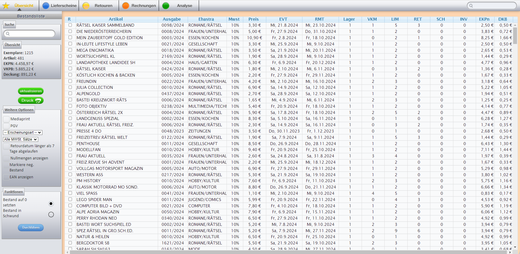 PiA listet alle Bestands-Objekte auf – und das inkl. der Deckungsbeiträge. Praktisch: Zusätzlich können Sie Artikel überprüfen, deren Remissionstermin mehr als 7 Tage zurück liegt.